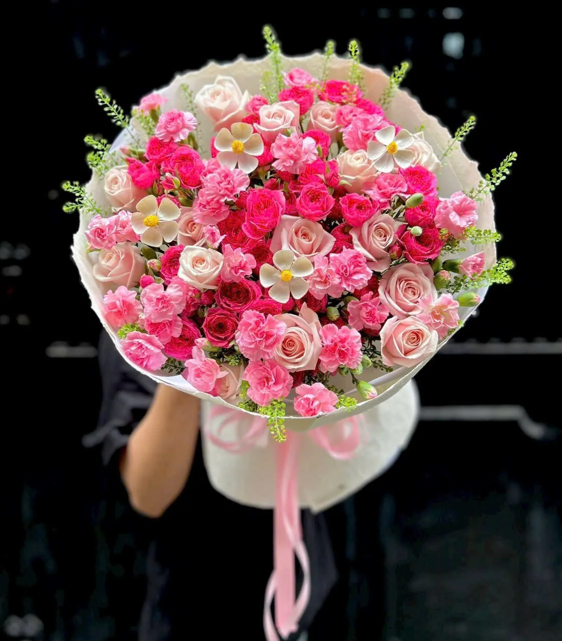 Những bông hoa hồng Sofia tượng trưng cho tình yêu và niềm hạnh phúc, trong khi hoa cẩm chướng thể hiện sự quan tâm và tình cảm chân thành. Thiết kế bó hoa tròn đầy đặn cùng lớp giấy gói trắng cao cấp giúp tôn lên sắc hồng rực rỡ của hoa.